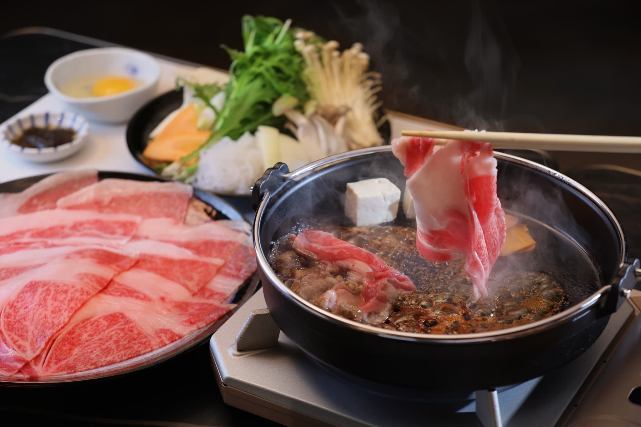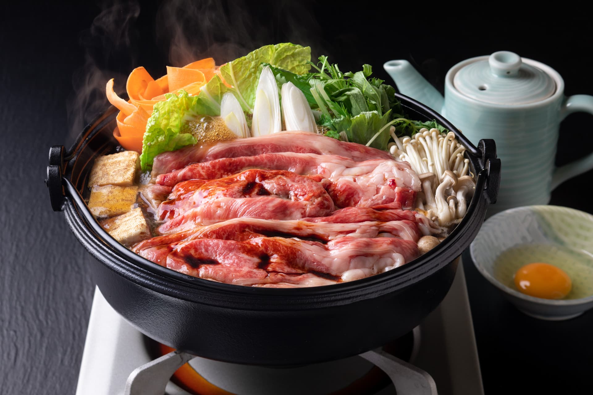 クリスタルヴィラ直営店の「しゃぶ庵」のすき焼きを、ケータリングでお届けいたします。 甘いお肉が特徴の“アグー豚”を、お部屋で贅沢にご堪能ください。